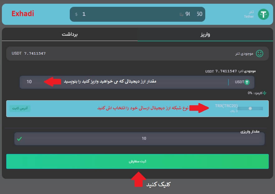 آموزش تصویری واریز به کیف پول ارز دیجیتال Exhadi | خرید تتر TRC20 | خرید تتر ERC20 | خرید تتر BEP20