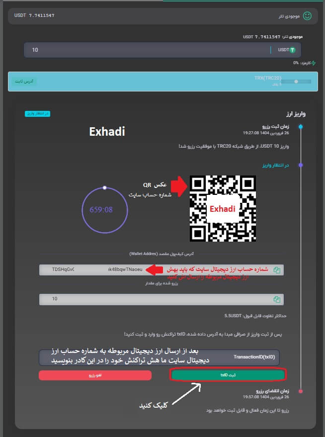 4 – در مرحله دوم فرم واریز ارز دیجیتال مربوطه ، خود سایت ما ، برایتان شماره حساب ارز دیجیتال سایت Exhadi ما را نشان خواهد داد ، شما می توانید ارز دیجیتال مورد نظر را به شماره حساب ارزی سایت ما از سایت های دیگر یا کیف پول شخصی و … ارسال نمایید و سپس در کادر transaction ID(txID) هش تراکنش ارسال ارز دیجیتال خود را بنویسید و سپس به دکمه ی ” ثبت txID ” کلیک کنید . مثل شکل زیر :