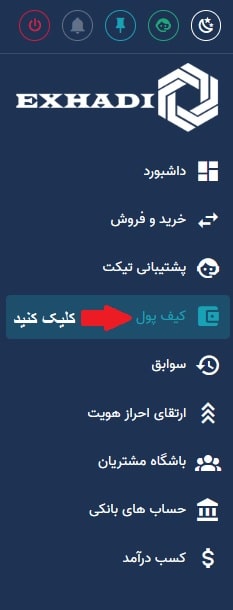 1 – ابتدا وارد حساب کاربری خود در سایت صرافی ارز دیجیتال ایکس هادی Exhadi شده و سپس به منوی کیف پول کلیک می کنید ، طبق شکل زیر :