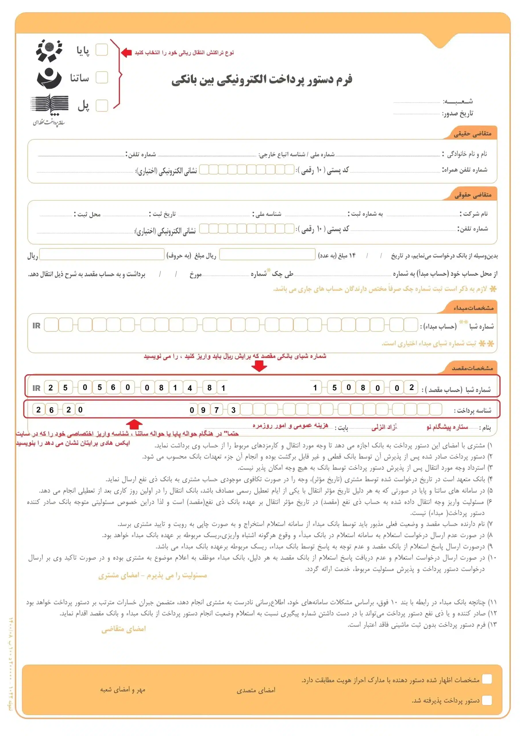 آموزش نحوه ی پر کردن فرم انتقال پول در تراکنش ریالی حواله پایا یا حواله ساتنا در مراجعه حضوری به شعبات بانک ها ![]()