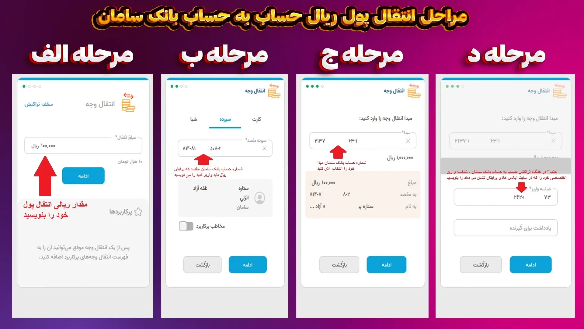 در صورتی که از حساب بانک سامان واریز شناسه دار انجام دهید ، بلافاصله پول تومان به حساب سایت صرافی ارز دیجیتال ایکس هادی منتقل شده و شما میتوانید خرید و فروش ارزهای دیجیتال خود را انجام دهید. بدین منظور ، ابتدا وارد موبایلت بانک سامان یا اینترنت بانک سامان خود شده و روی گزینهی انتقال وجه کلیک کنید و طبق مرحله (الف) در شکل زیر ، در کادر مبلغ انتقال ، مقدار ریالی انتقال پول خود را بنویسید و سپس طبق مرحله (ب) در کادر سپرده مقصد ، شماره حساب بانک سامان مقصد نشان داده شده در سایت ایکس هادی ، که برایش ریال باید واریز کنید را می نویسید و بعدا” طبق مرحله (ج) در کادر مبدا ، شماره حساب بانک سامان مبدا خود را انتخاب اش کنید و در مرحله (د) آخر در کادر شناسه واریز ، حتما” شناسه واریز اختصاصی خود را که در سایت ایکس هادی برایتان نشان می دهد را بنویسید . پس از لمس گزینه ادامه و تایید انتقال وجه حساب به حساب موبایلت یا اینترنت بانک سامان خود ، مبلغ ریالی مورد نظر به موجودی تومانی کیف پول حساب کاربری شما در سایت صرافی ارز دیجیتال ایکس هادی منتقل خواهد شد.