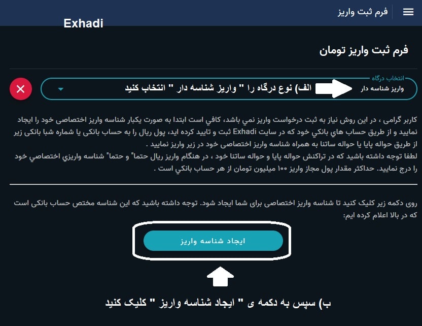 کاربر گرامی برای استفاده واریز تومان از طریق روش واریز شناسه دار به موجودی تومانی کیف پول و شارژ کردن حساب کاربری خود در سایت ایکس هادی Exhadi طبق مراحل زیر به ترتیب اقدام می کنید :