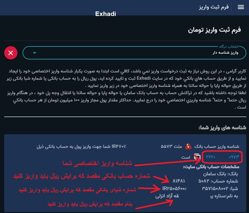 آموزش واریز شناسه دار تومانی به حساب صرافی ایکس هادی Exhadi
