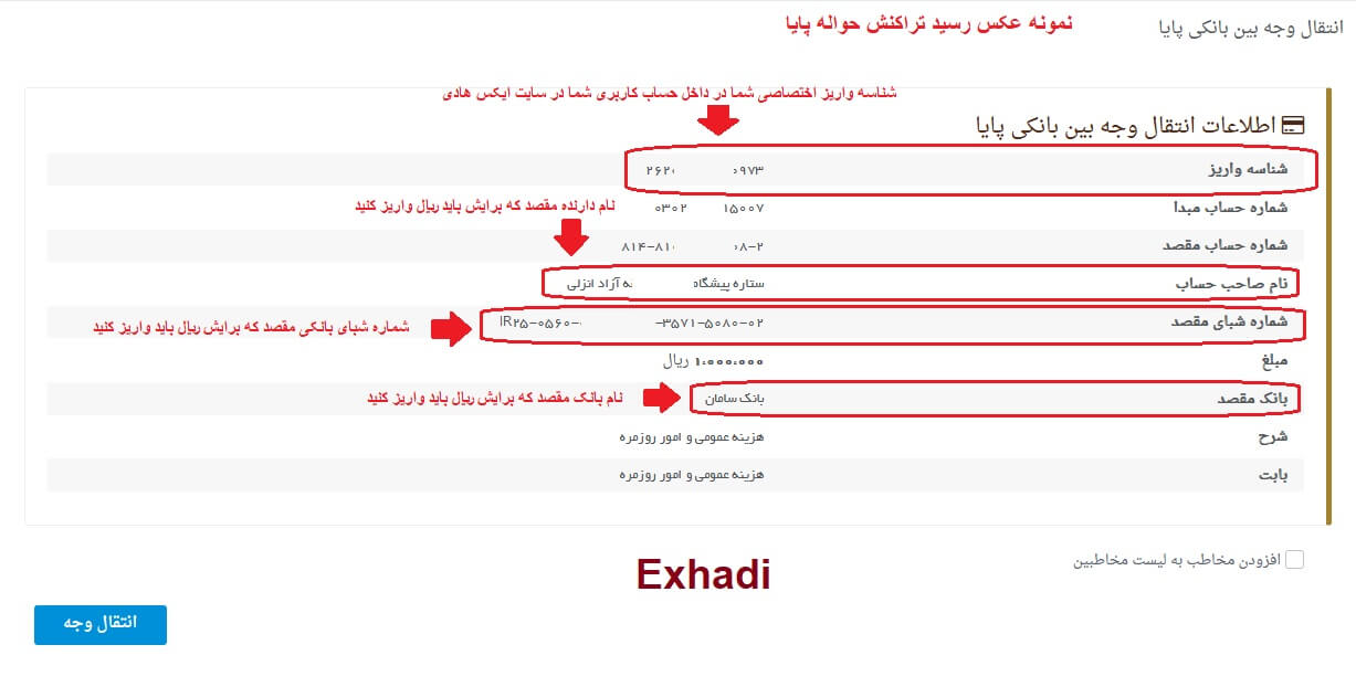 - زمانی واریزی شما در حساب کاربری سایت ایکس هادی Exhadi اعمال می شود که به حساب مقصد نشسته باشد (پیشنهاد میشود از انتقال حساب به حساب بانک سامان یا حواله ساتنا استفاده شود که واریزی شما سریعتر اعمال شود).