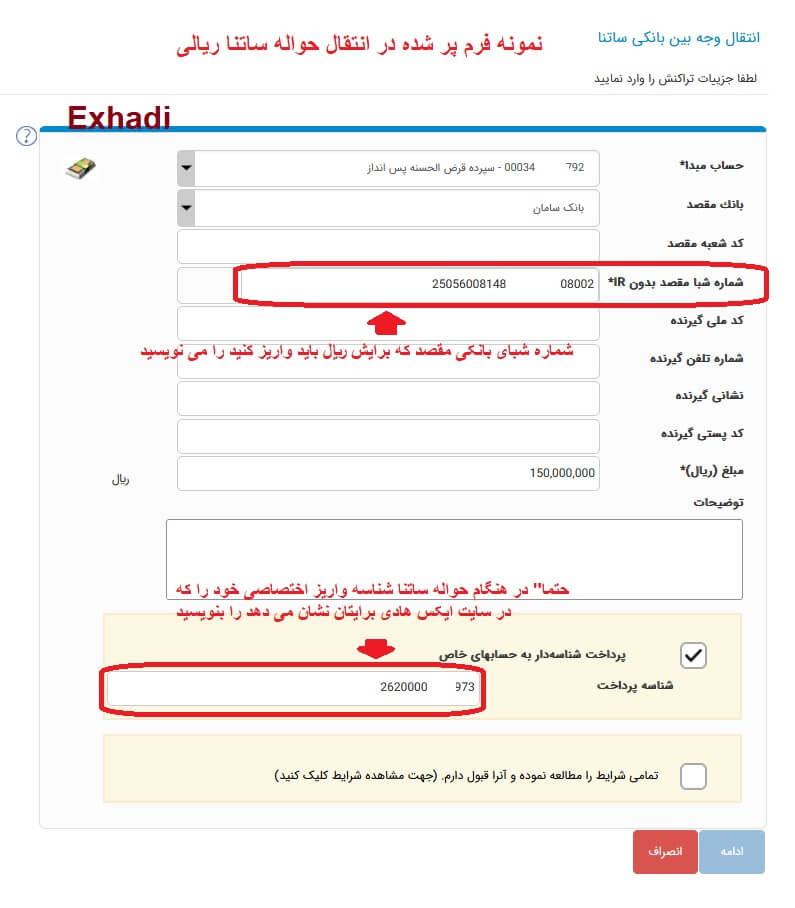 آموزش نحوه ی پر کردن فرم انتقال پول در تراکنش ریالی حواله ساتنا